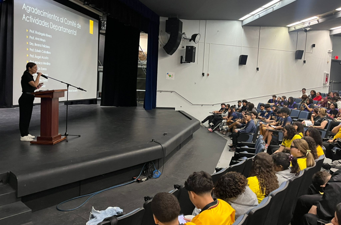 Prof. Rosangela Rivera on the UPRA Theater welcoming the students to the OpenHouse.