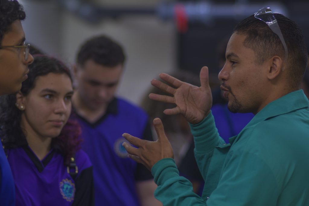 Balloon competition demonstration performed by the following lefto to right: student Kevin, Prof. Ana Moya, and student Zahimar Medina.